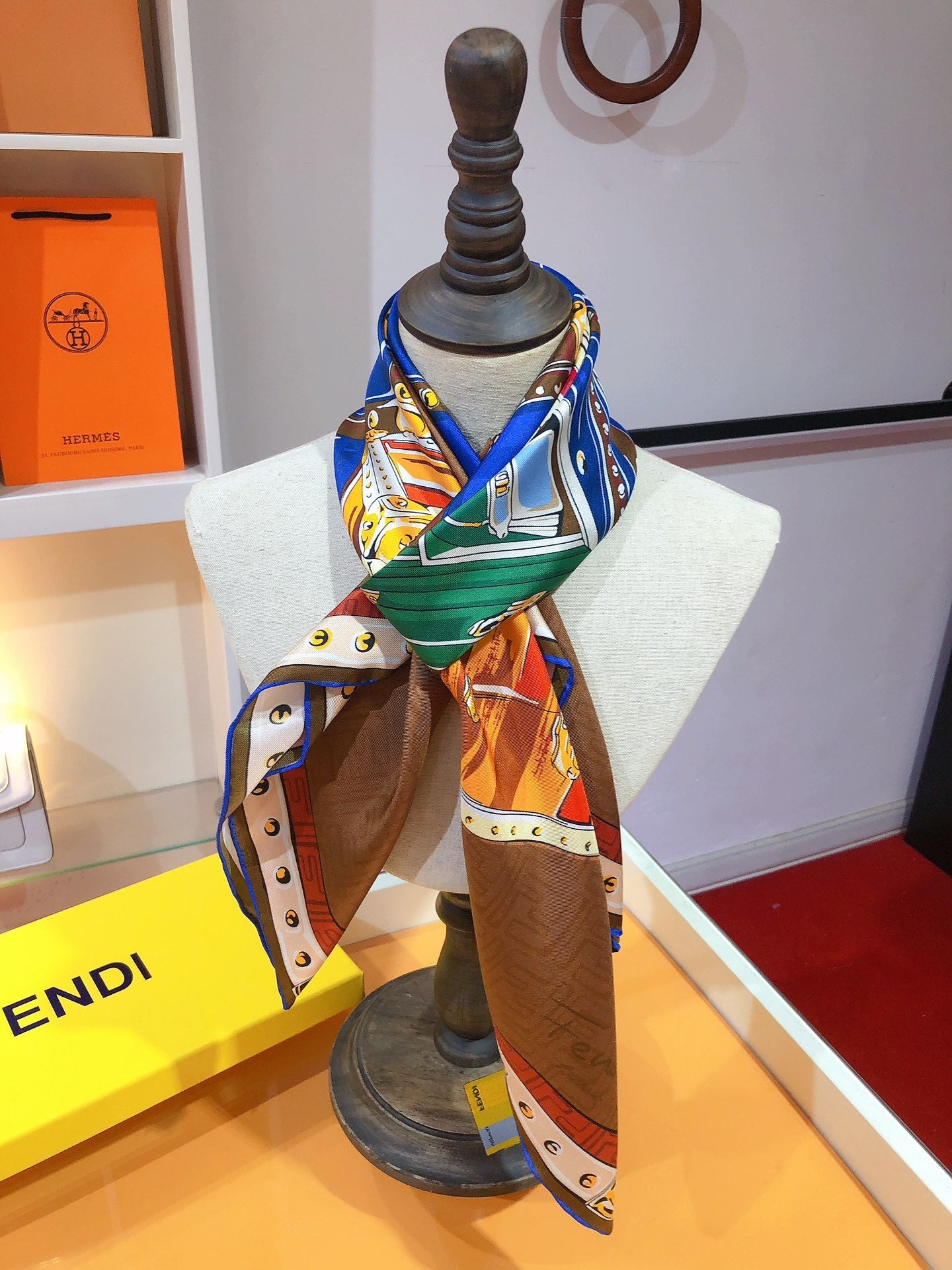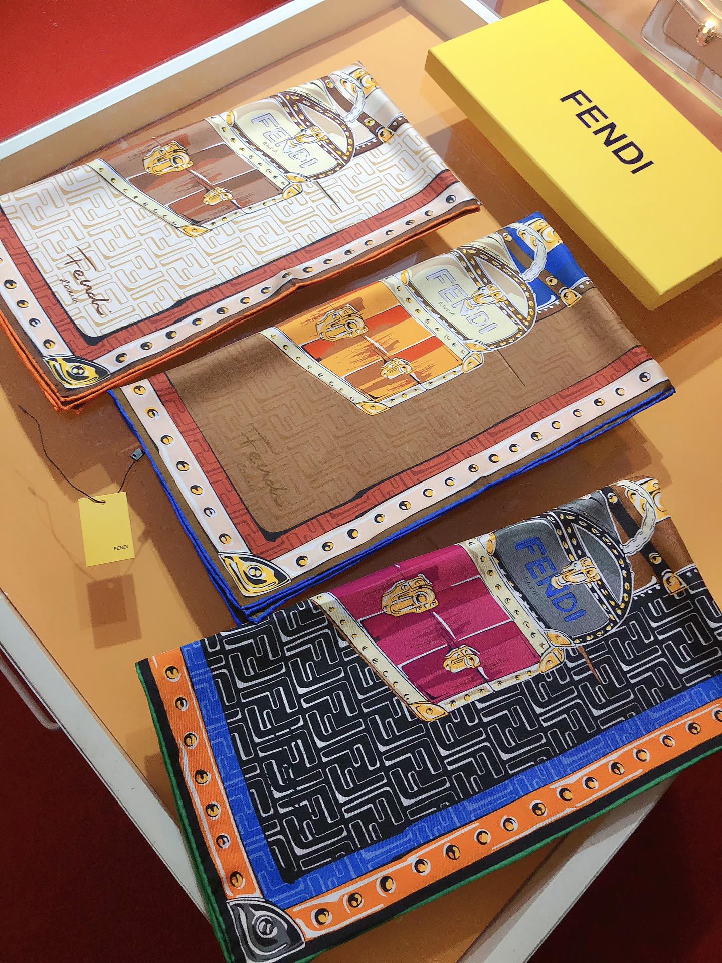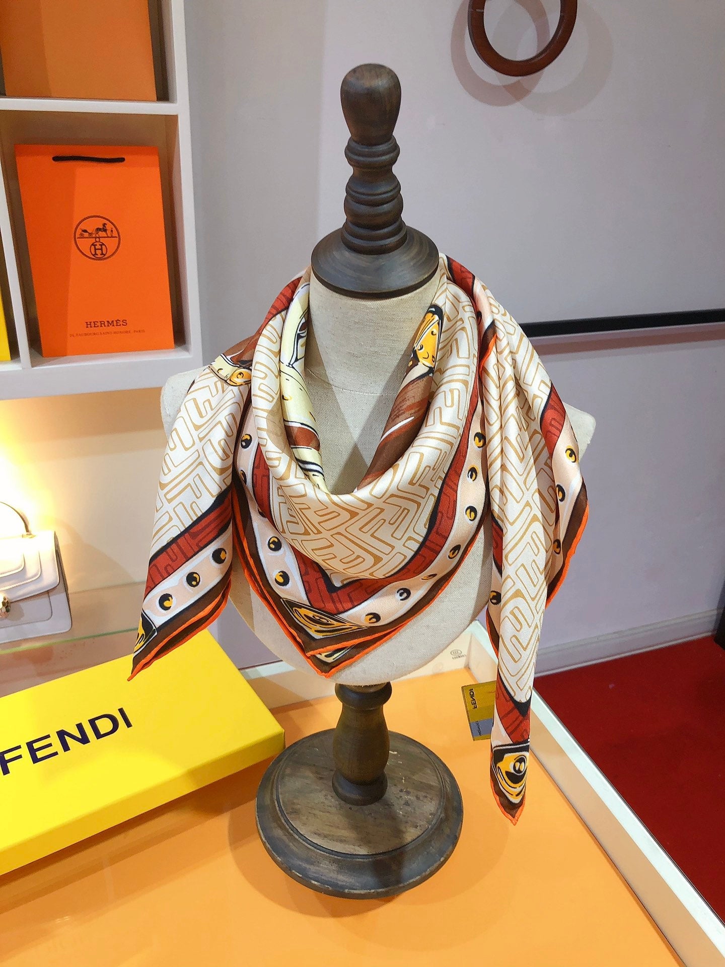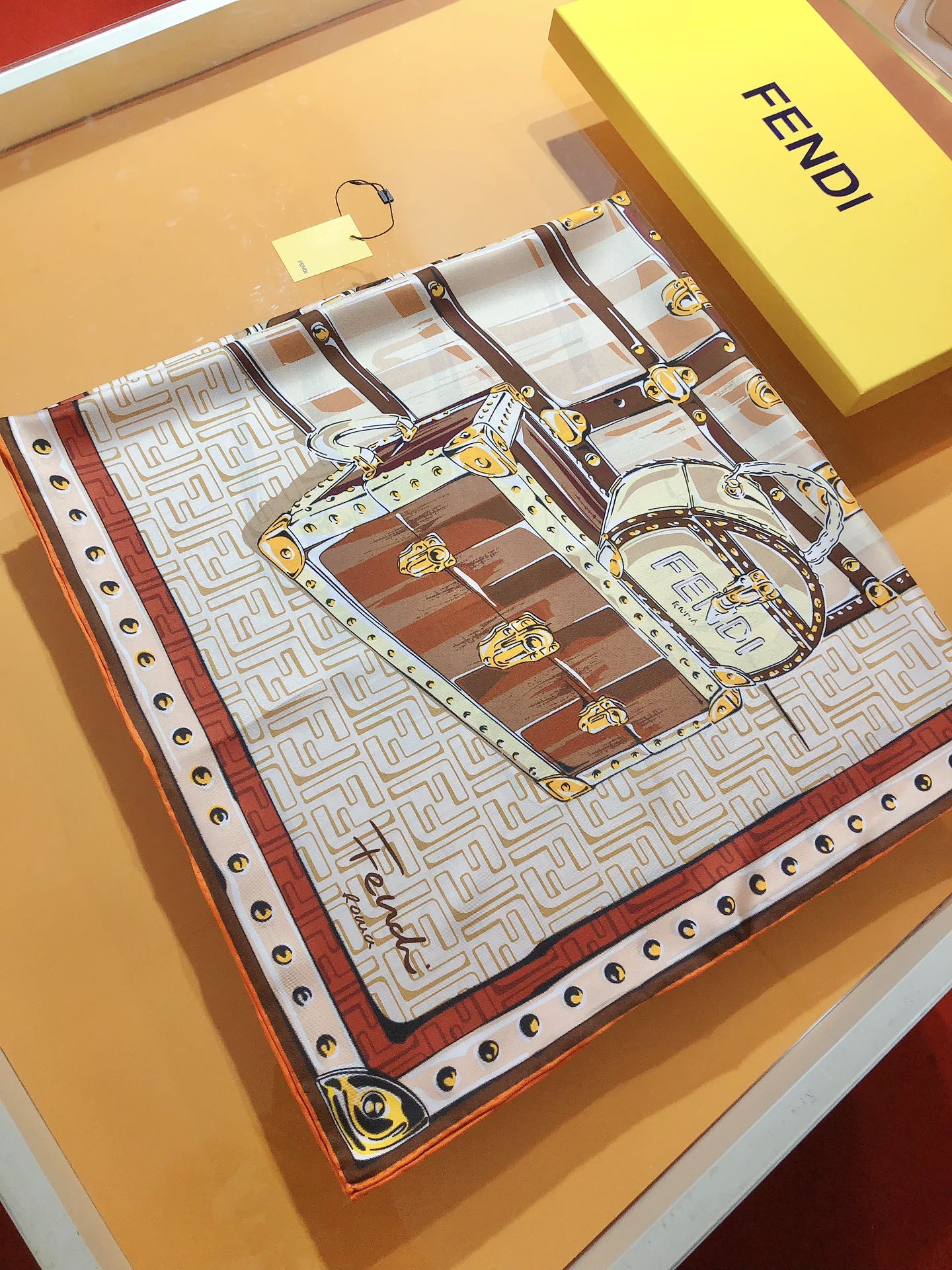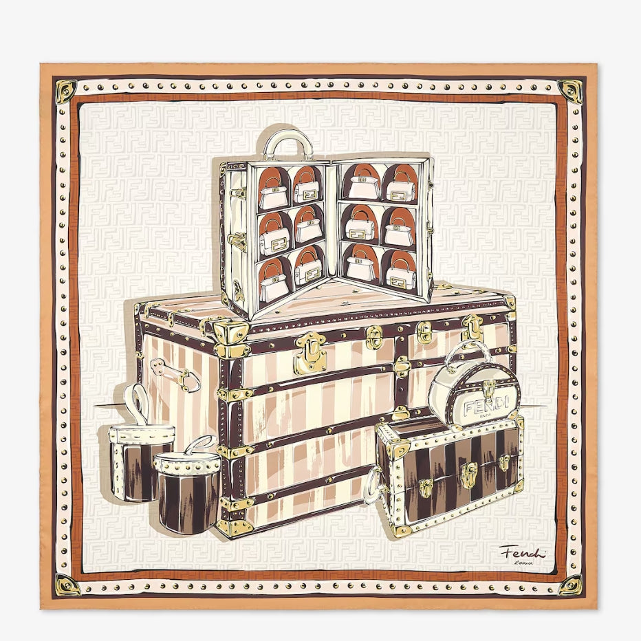 - Square scarf. made of mulberry silk. with vivid FF pattern background. Features vintage-inspired handbag graphic print in multiple shades of brown